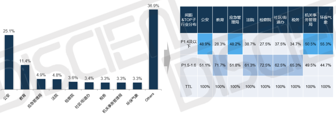 2、分細分行業(yè)看:公檢法、教育、應急等釋放的項目個數(shù)較高,且P1.5-1.6與P1.4以下的應用存在明顯的行業(yè)差異;